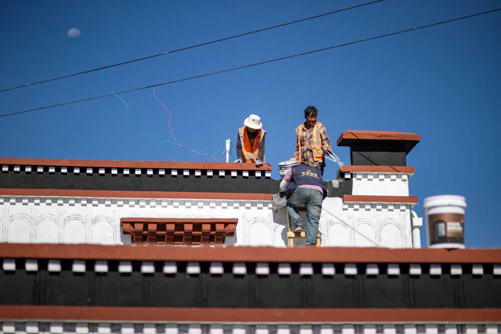 2025年8月11日,定日县曲洛乡措昂村彩绘工匠扎西、旦增贡加、拉巴在工作现场。他们都是本村受灾群众,通过参与新房建设获得劳动报酬。