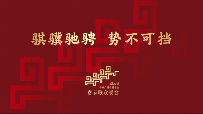 中央广播电视总台12月10日发布2026年春节联欢晚会主题和主标识——主题为“骐骥驰骋 势不可挡”;主标识从“骐骥驰骋”中提炼“四马齐驱”的创意灵感,融合中国传统云纹、雷纹、回纹的经典元素,勾勒出四匹骏马齐头并进、拾级而上的视觉意象,既彰显传统美学韵味,又传递出奔腾奋进的时代气息。
