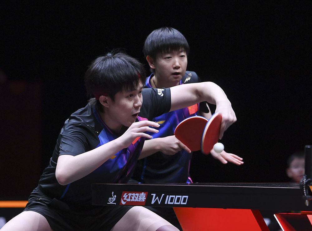 12月10日,王楚钦(左)/孙颖莎在比赛中。新华社记者 陈铎 摄