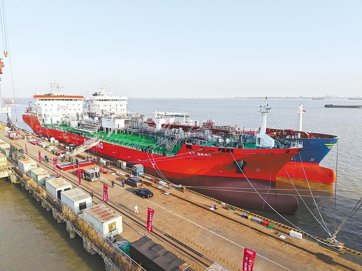 万吨级不锈钢化学品船2号船“兴通海豹”轮命名交付现场。