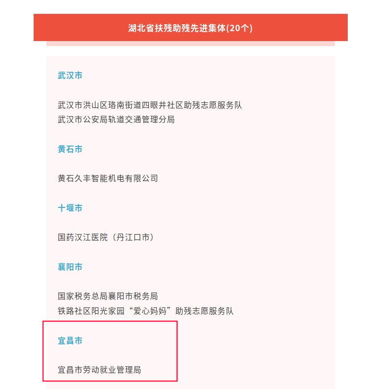12月2日,第七次湖北省自强模范暨助残先进表彰大会在武汉隆重召开。宜昌市劳动就业管理局作为受表彰单位应邀参会,被授予“湖北省扶残助残先进集体”荣誉称号。