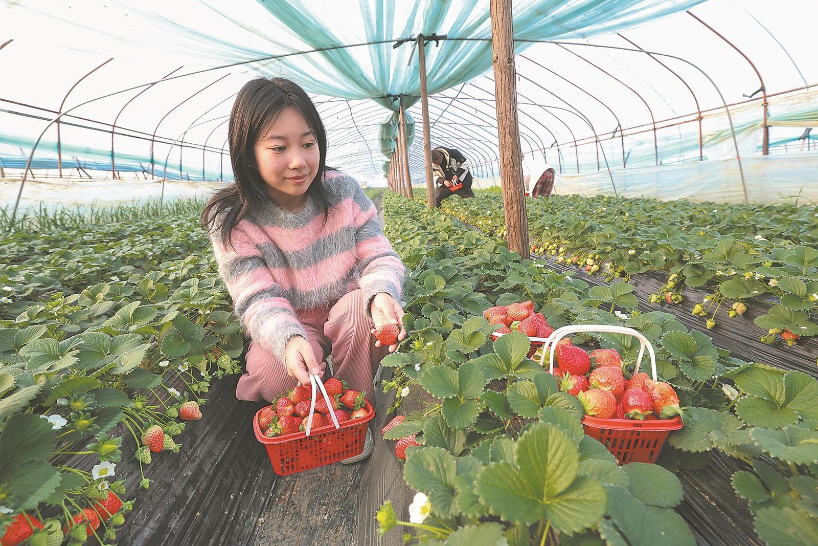 12月10日,游人在襄城区卧龙镇新建村草莓温室大棚里采摘新鲜的草莓。近年来,襄城区卧龙镇依托近郊优势,将传统的农业种植变为田园观光、果蔬采摘、农事活动体验,形成地域特色,释放生态效益。目前,卧龙镇温室大棚草莓进入成熟采摘季,草莓采摘游成为市民休闲的新选择。
