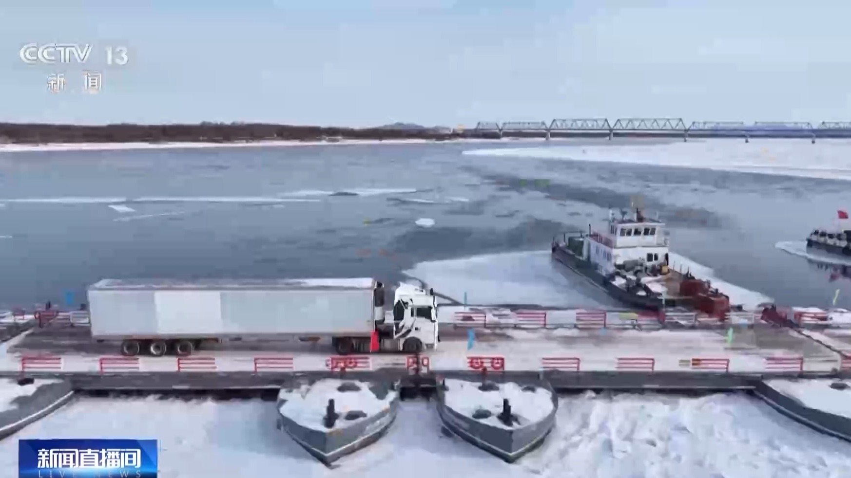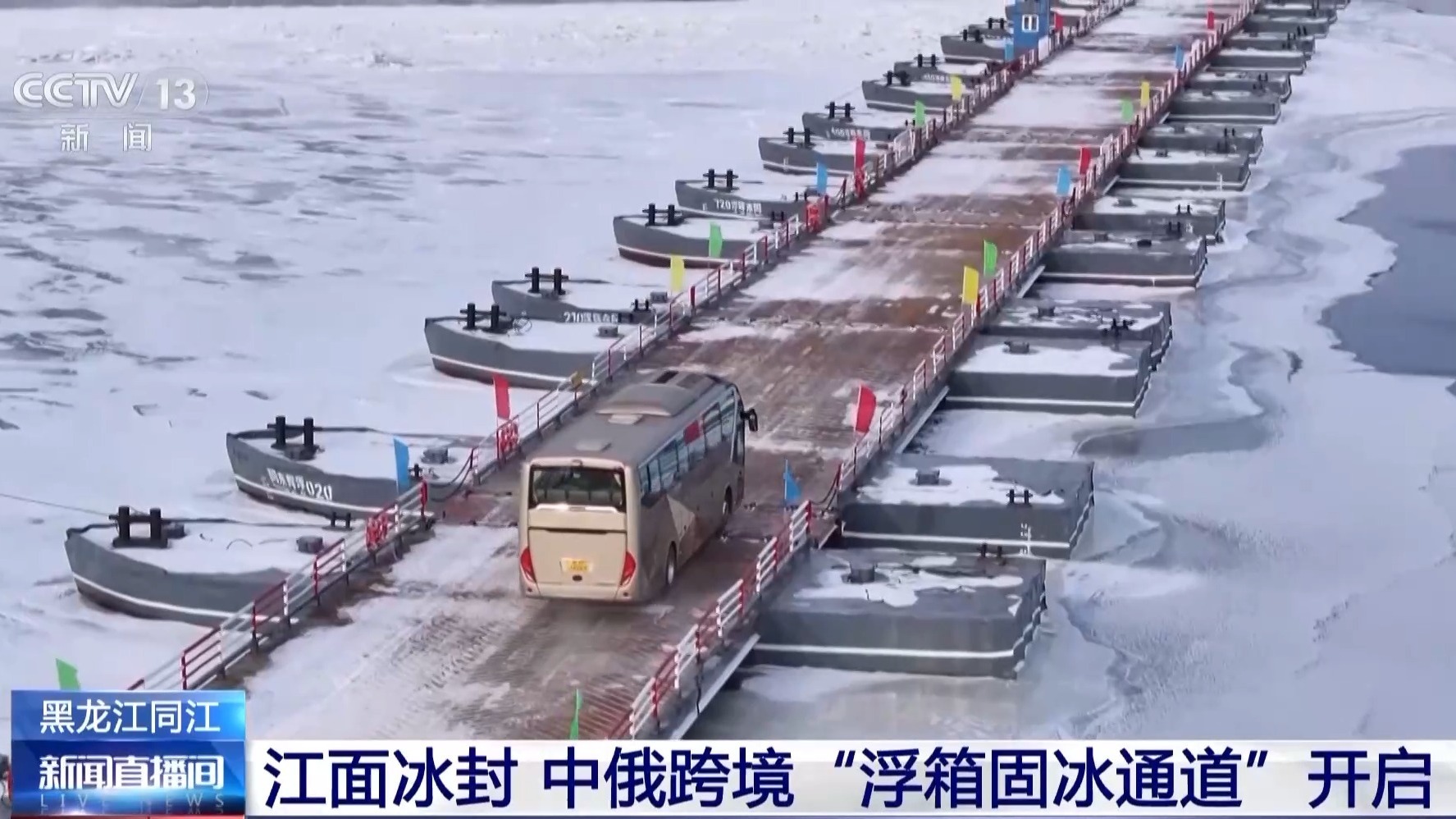 浮箱固冰通道采用“冬建春拆”模式,每年黑龙江夏运停航冰封后铺架,次年4月初黑龙江开江流冰前拆解,每个周期运行大约90天。同江口岸是中国对俄罗斯水路、公路、铁路“三路并进”的国际口岸,夏季有摆渡船,流冰期有气垫船,冬季有浮箱固冰通道,可以实现一年四季通关。