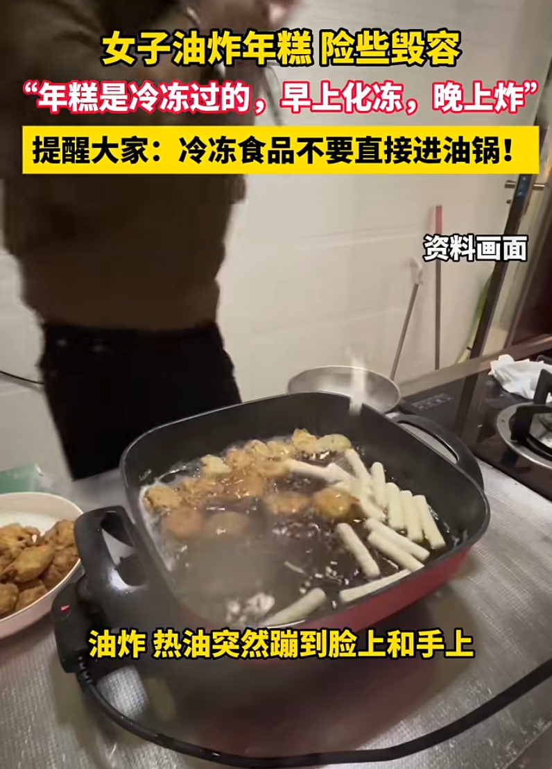 2025年12月4日,安徽界首一名女子在家油炸年糕,没想到刚把年糕下锅,热油就 “猛扑” 到她脸上、手上,险些毁容。