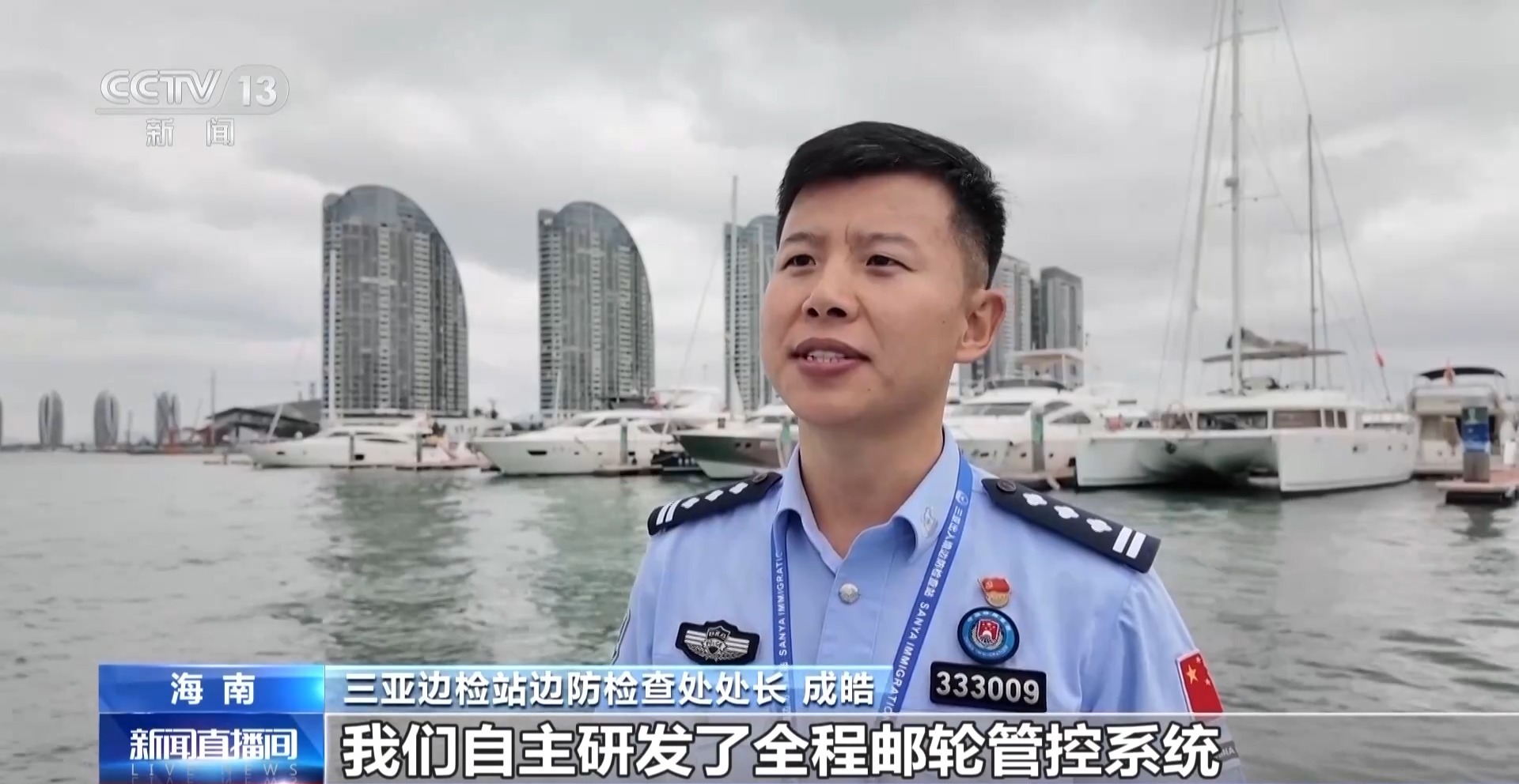三亚边检站边防检查处处长 成皓:我们自主研发了全程游轮管控系统和智慧游艇管控系统,两个系统及大数据管理、人脸识别卫星定位、AR全景等多种前沿技术应用,覆盖邮轮母港勤务、挂靠港勤务、海上游勤务、游艇出海申报、在港管理、口岸限定区域管理等各类勤务模式,使口岸管理更加智能。