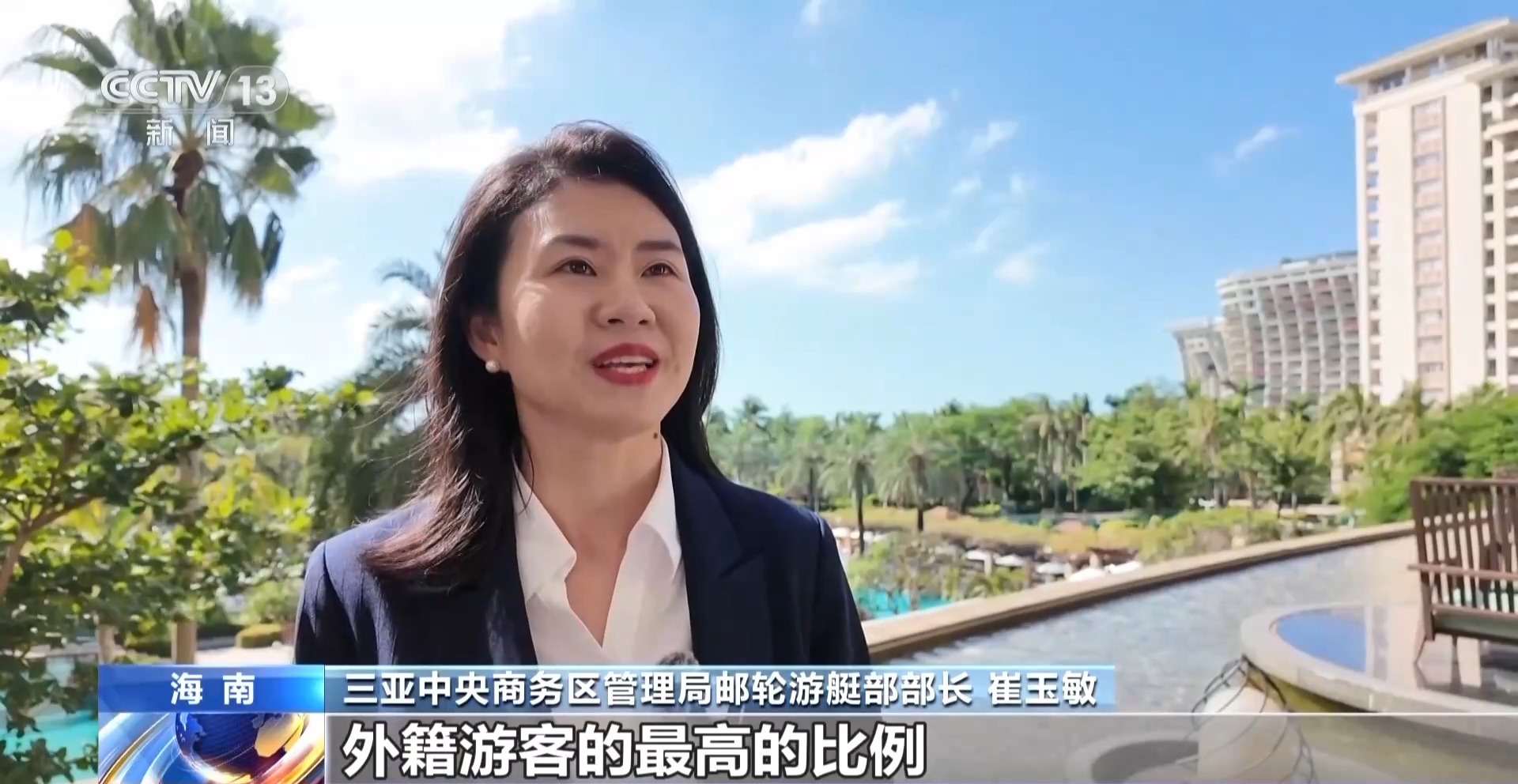 三亚中央商务区管理局邮轮游艇部部长 崔玉敏:我们今年首访的比率同比提高了300%。像“诺唯真奋进号”首访三亚的旅程中携带过来1800名游客,外籍游客的比例达到了99%,创下了2023年9月份三亚的国际邮轮市场复苏以来外籍游客的最高的比例。