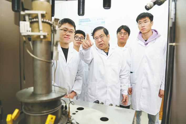 唐辉明(左三)指导研究生开展实验。(受访单位供图)