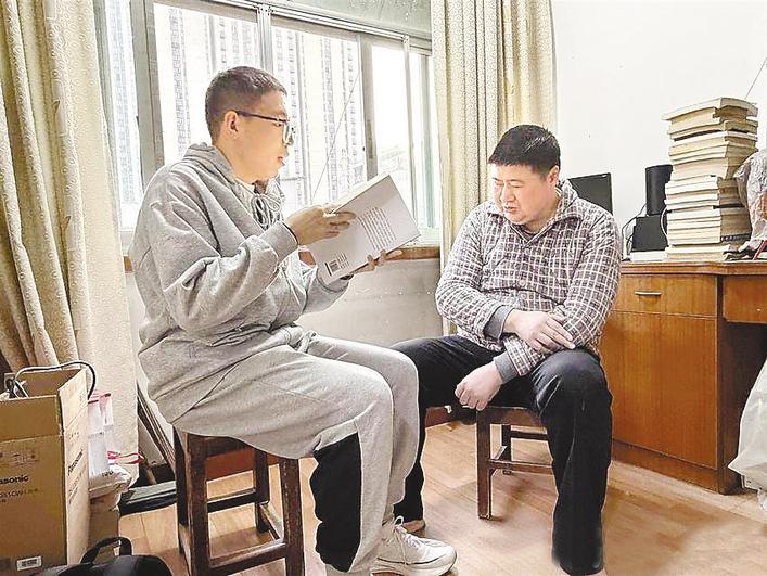 武汉大学物理科学与技术学院学生李乐煜为周顺读物理专业书籍。 (湖北日报全媒记者 龚雪 摄)