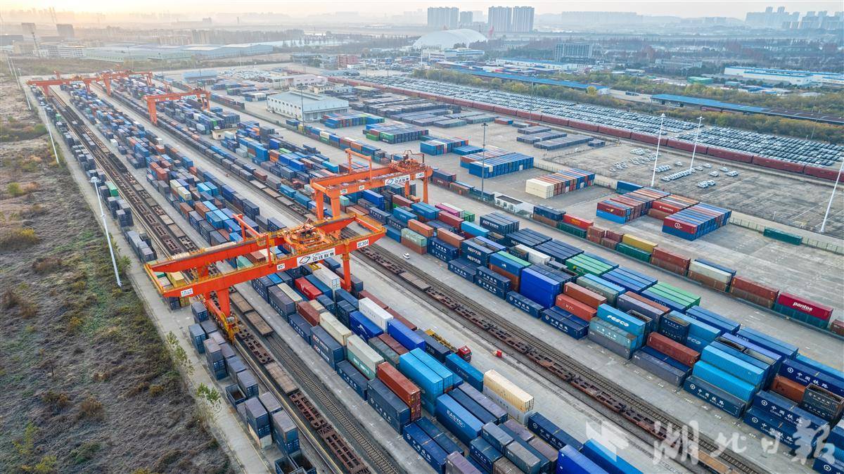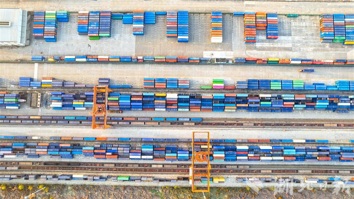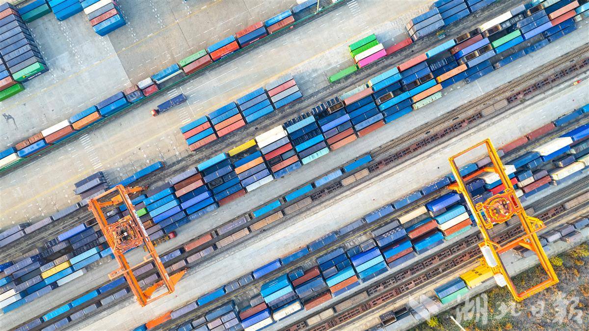 12月14日,中欧班列(武汉)吴家山站一派繁忙景象。据介绍,中欧班列(武汉)近年来长期保持稳健运行态势,年度发行量已经连续三年突破1000列大关。2025年截至12月,发运量破千列,其中发往欧洲方向的列车已达378列,同比增长58.16%。机械设备、建材、新能源汽车、电子产品等“湖北造”正通过中欧班列(武汉)源源不断地“走”向世界。(视界网 马二虎 摄)
