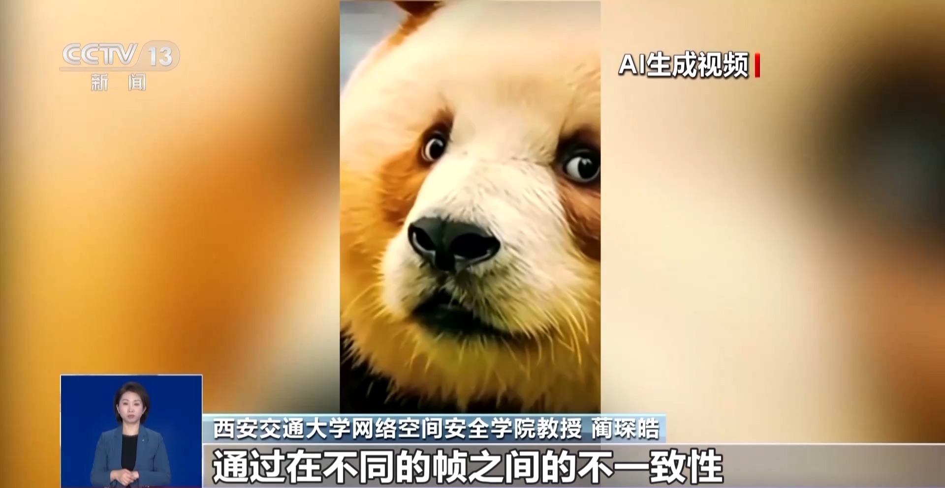 西安交通大学网络空间安全学院教授 蔺琛皓:经过一些稍微慢放或者仔细去观察,我们可以发现在不同的帧之间,它的行为其实是没有那么连续的,通过在不同的帧之间的不一致性,我们也可以有效地去发现和分辨出来,这些内容到底是真实的还是虚假的。