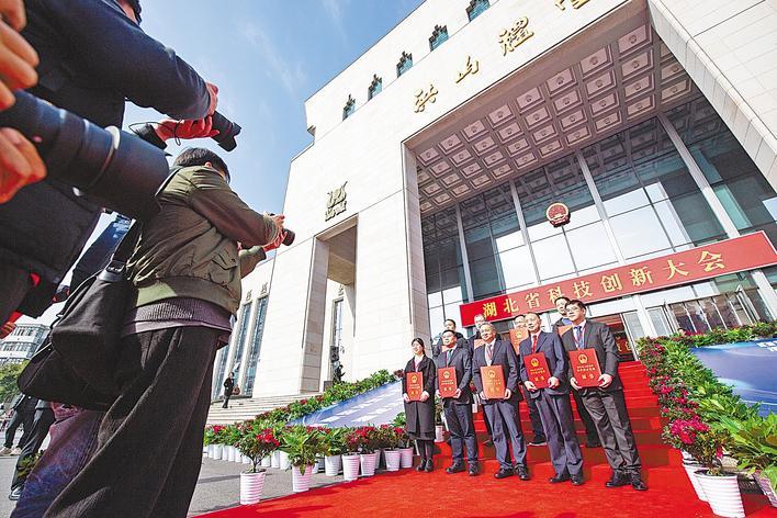 2024年度湖北省科学技术奖获奖团队在武汉洪山礼堂前合影。(湖北日报全媒记者 何宇欣 摄)