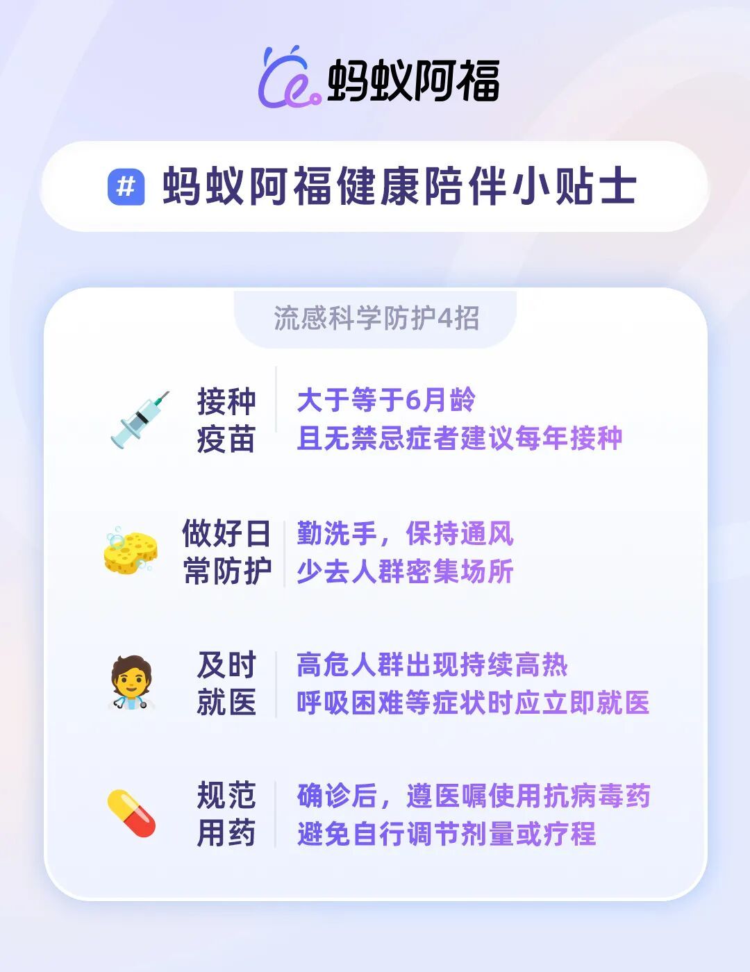流感虽然季节性强,但科学防护可有效降低风险。目前来看,预防流感最有效的方式依然是接种疫苗+做好日常防护+药物预防。