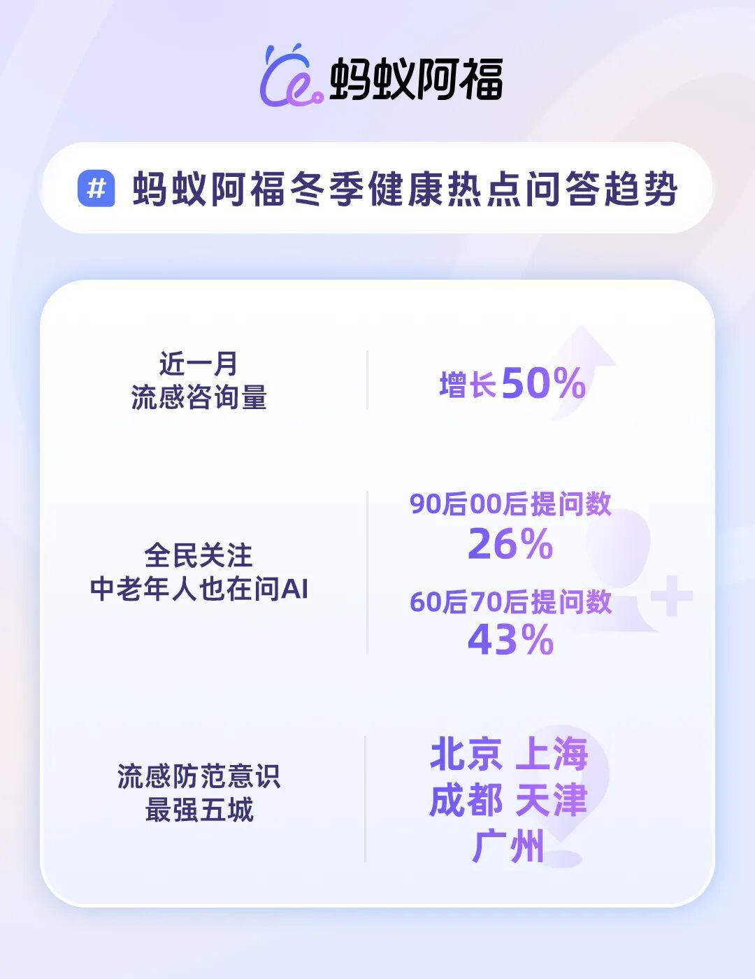 冬季是流感高发季,在线的流感相关咨询量随之激增。据AI健康应用“蚂蚁阿福”的统计数据显示,12月以来,流感相关咨询量环比上涨了50%,北京、上海、成都、天津、广州的居民咨询最多,预防意识位居前五。