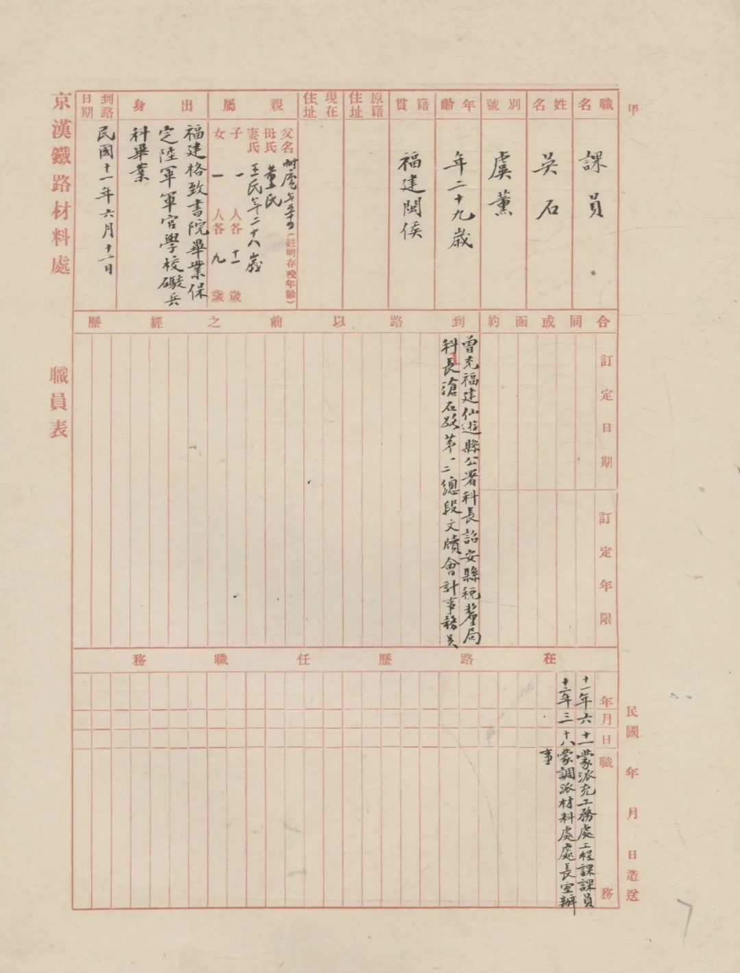 这份题名为“中华国有京汉铁路管理局吴石履历表”的档案显示,1922年至1924年间,吴石烈士曾在京汉铁路管理局工作。他出生于1894年,填写表格时(1923年)为29周岁。