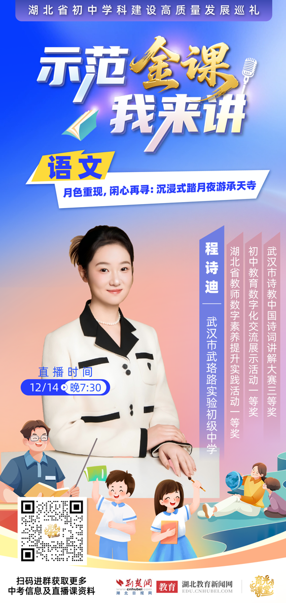 荆楚网(湖北日报网)讯(记者齐一璇)“大家好,我是来自武珞路实验初级中学的语文教师程诗迪。很高兴和大家相聚,共度一段难忘的语文时光。”12月14日,在湖北省初中学科建设高质量发展巡礼活动中,武汉市武珞路实验初级中学九年级语文教师程诗迪推介的课例“月色重现,闲心再寻:沉浸式踏月夜游承天寺”,以其创新的教学设计和沉浸式的课堂体验,吸引了广泛关注。