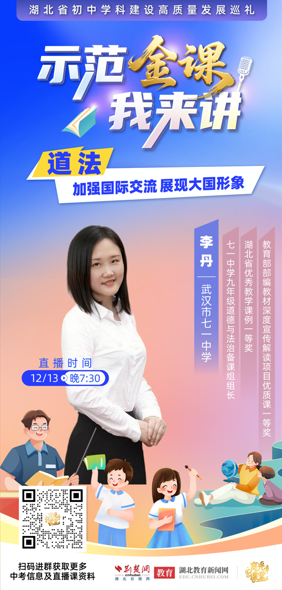 荆楚网(湖北日报网)讯(记者齐一璇)在当今全球化的时代浪潮下,如何让学生深刻理解中国在国际舞台上的角色,增强民族自豪感与全球意识,成为教育领域的重要课题。12月13日,一场聚焦道德与法治学科、展现大国形象的云端课堂精彩开启。由荆楚网(湖北日报网)策划的“示范金课我来讲——湖北省初中学科建设高质量发展巡礼”活动迎来特别分享,武汉市七一中学道德与法治备课组组长李丹,以一堂独具匠心的课程“加强国际交流 展现大国形象”,为学生们打开了一扇认识中国外交理念与全球担当的窗口。
