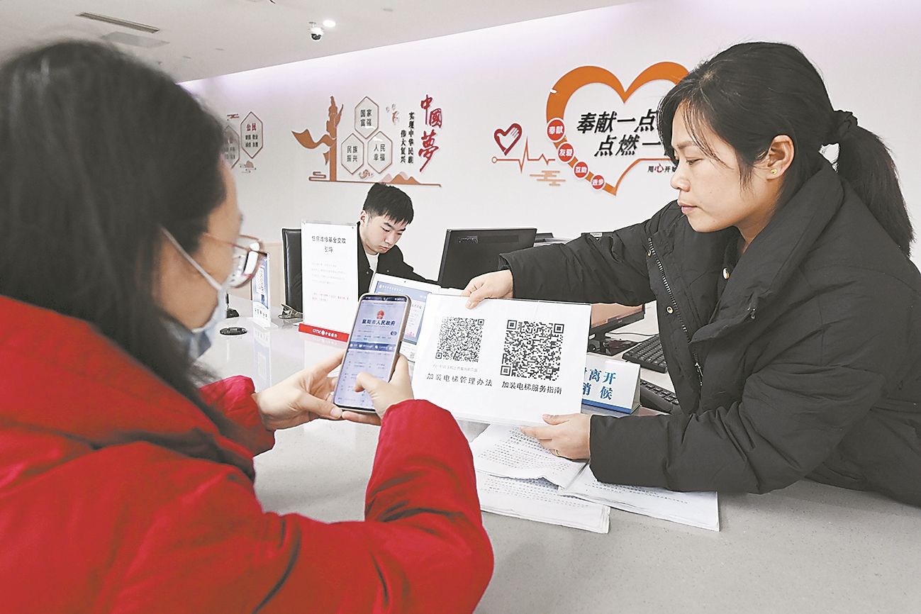 ▲市政务服务中心住新局窗口工作人员讲解电梯加装政策。