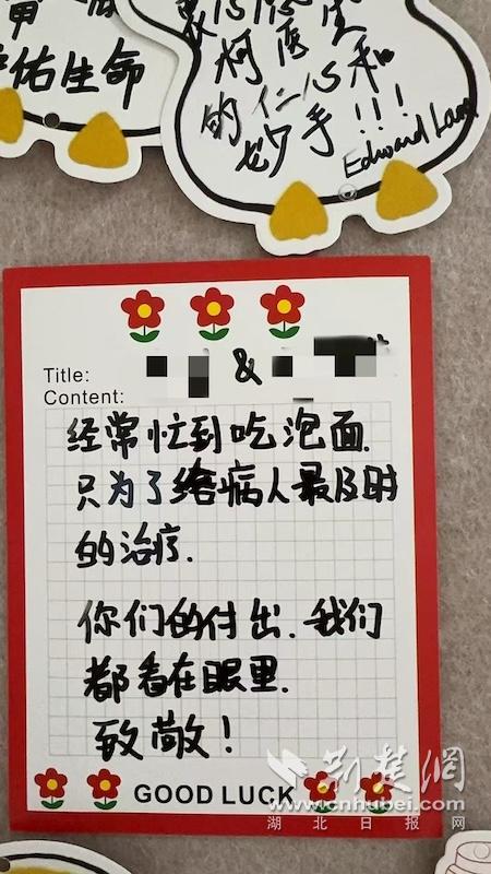 然而,随着时间推移,张星护士长和同事们发现,墙上关于意见和建议的便笺越来越少,取而代之的,是越来越多的感谢、鼓励和理解的话语。有一次,她和同事看到一位患者的留言:“经常忙到吃泡面,只为了给病人最及时的治疗。你们的付出,我们都看在眼里,致敬!”这句来自患者的理解,让在场的医护人员瞬间破防,倍感温暖。
