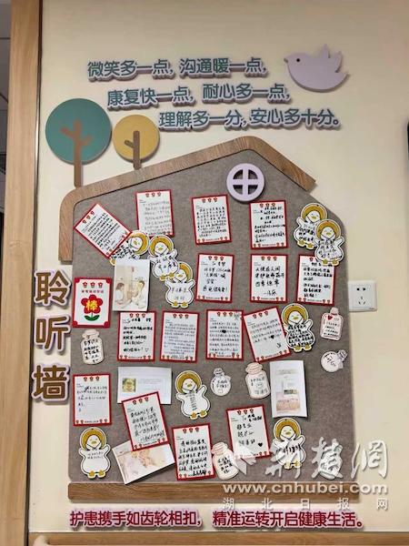 于是,一个象征着“家”的温馨小屋造型的“聆听墙”在宣传栏处落成,旁边准备了各式各样的彩色便笺纸,方便患者和家属随时书写、粘贴。