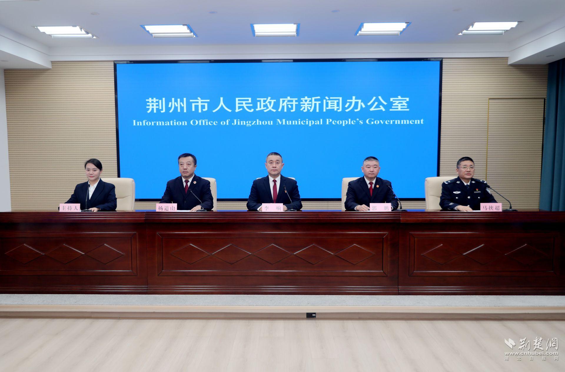 荆州市委政法委副书记李响,市中级人民法院党组副书记、副院长郭鹏,市人民检察院党组成员、副检察长杨道山,市公安局党委委员、副局长马挟超等出席发布会介绍相关情况,并回答现场记者提问。
