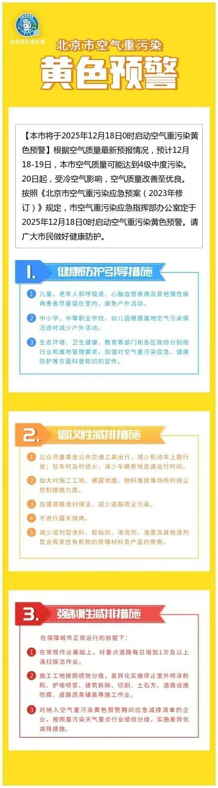 按照《北京市空气重污染应急预案(2023年修订)》规定,北京市空气重污染应急指挥部办公室定于2025年12月18日0时启动空气重污染黄色预警。请做好健康防护。