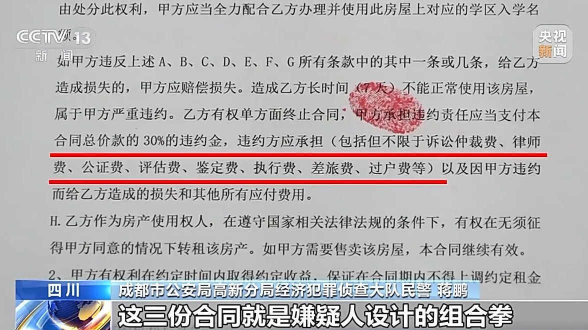 成都市公安局高新分局经济犯罪侦查大队民警 蒋鹏:这三份合同就是嫌疑人设计的组合拳。他们用低息贷款、固定租金做诱饵,把真正的陷阱藏在《房屋托管合同》和《授权委托书》里,表面看是商业合作,实则是用“租金+违约金”取代了传统的“砍头息+服务费”,把非法高息拆分成看似合法的条款。