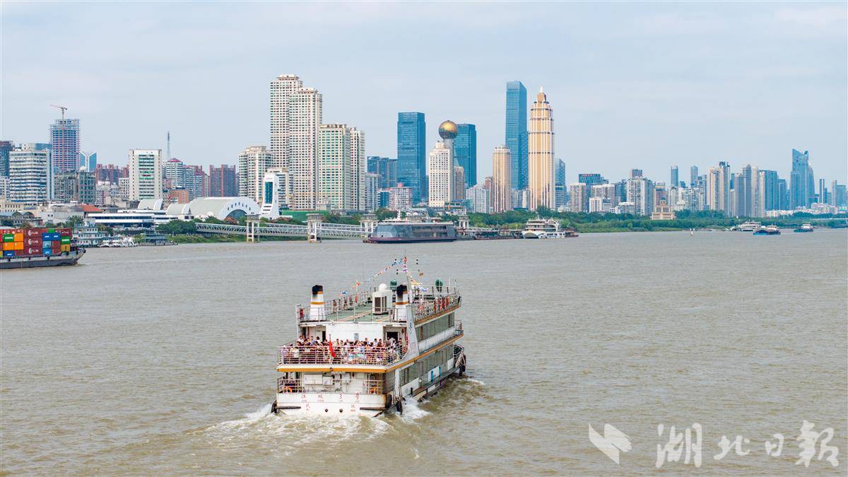 武汉长江江面,满载着游客来往于两江四岸的轮渡络绎不绝。(湖北日报全媒记者 何宇欣 摄)