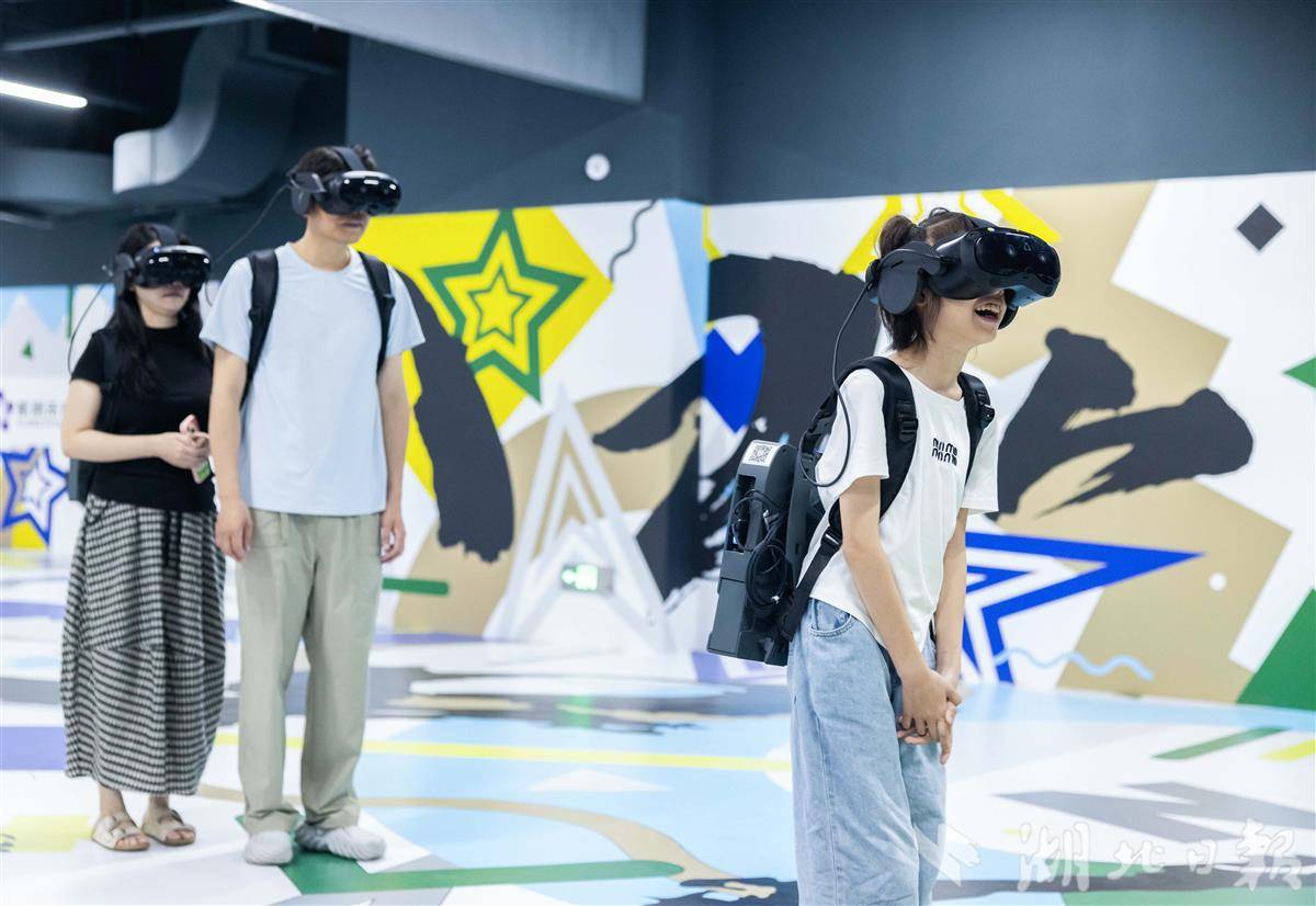 武昌滨江天街紫荆未来元宇宙体验馆人气十足,游客佩戴VR设备,瞬间“穿越”至武当仙山。(湖北日报全媒记者 薛婷 摄)