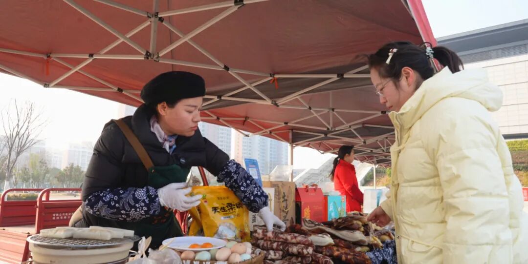在比赛现场的两侧,孝昌农特产品展销区和文创展示区人头攒动,小悟板栗、腊肉等本土好物整齐陈列,吸引了不少参赛选手和观赛群众驻足选购。