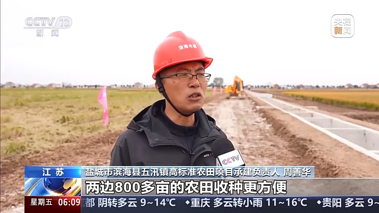 盐城市滨海县五汛镇高标准农田项目承建负责人 周善华:经过混凝土硬化的路面可以供老百姓收割的机械、播种的机械,还有运输粮食的车进出。两边800多亩的农田收种更方便。