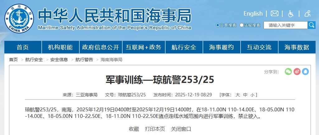 据中国海事局网站消息,三亚海事局发布航行警告,12月19日4时至14时,南海部分海域进行军事训练,禁止驶入。