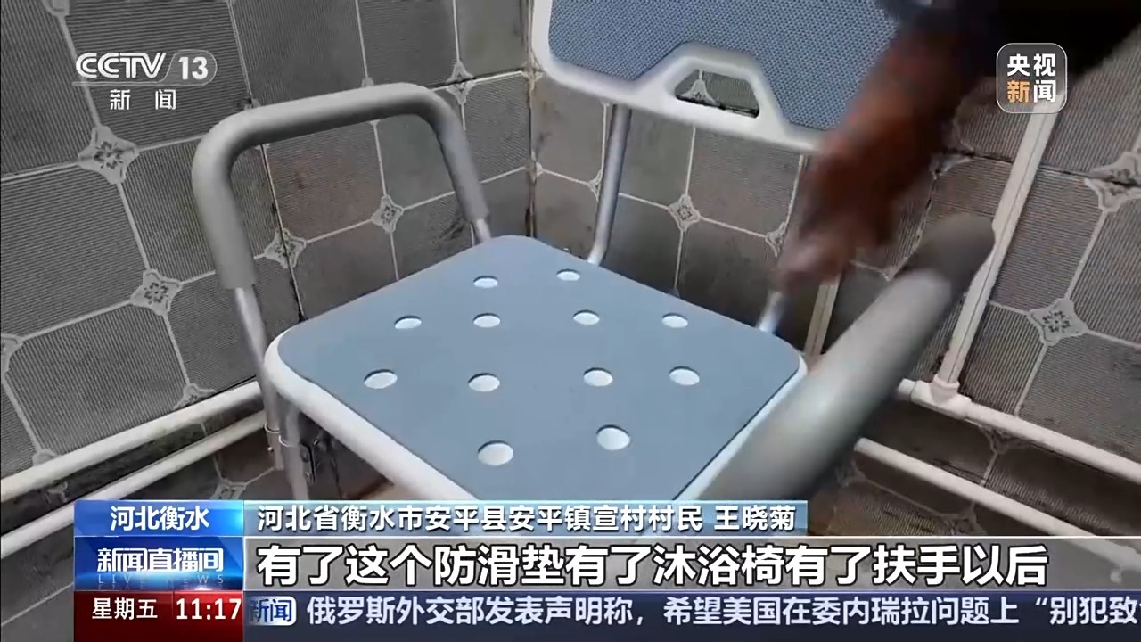 河北省衡水市安平县安平镇宣村村民 王晓菊:原先我给老头洗澡就一手扶着洗衣机,一手扶着把手。有了防滑垫、沐浴椅、扶手以后,心里特别踏实,也不怕他摔倒了。
