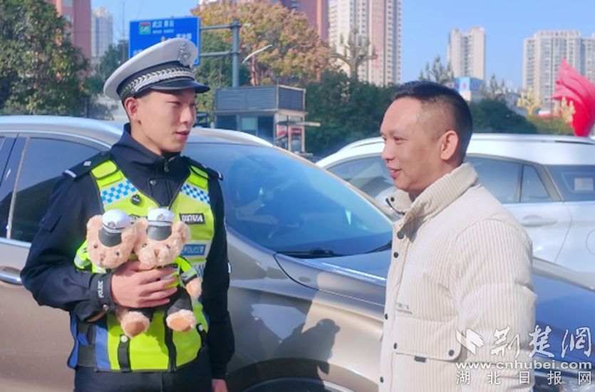 这温暖一幕被完整记录下来。事后,民警根据车牌信息联系上了车主李先生,在表达感谢与赞扬之后,特意准备了两只象征交通安全与文明善行的“交警小熊”玩偶,并于12月15日前往李先生的工作地点,将这份特别的致谢送到他的手中。