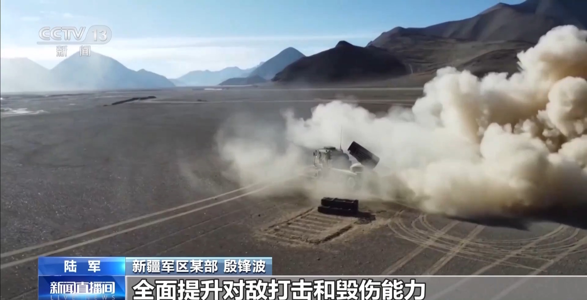 新疆军区某部 殷锋波:我们依托演训场的地形和特点,灵活采取多种射击方式,依托一体化指挥平台接收目标信息,运用火控系统决定诸元,并进行炸点修正,实现全自动自主射击,弹药装填车快速装填,优化实装实射训练,全面提升对敌打击和毁伤能力。