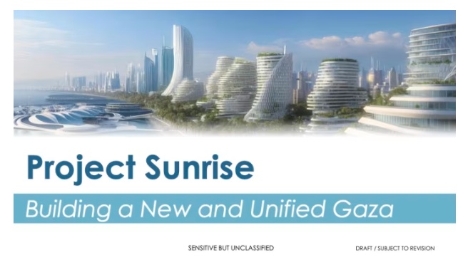 就在同一天,《华尔街日报》曝出猛料:由美国特使威特科夫与特朗普女婿库什纳领导的小组起草了一份“日出计划”,声称要用1120亿美元,把加沙从目前的废墟,建设成拥有海滨豪华度假村、高速铁路、智能电网等融高科技和时尚感为一体的豪华大都市。
