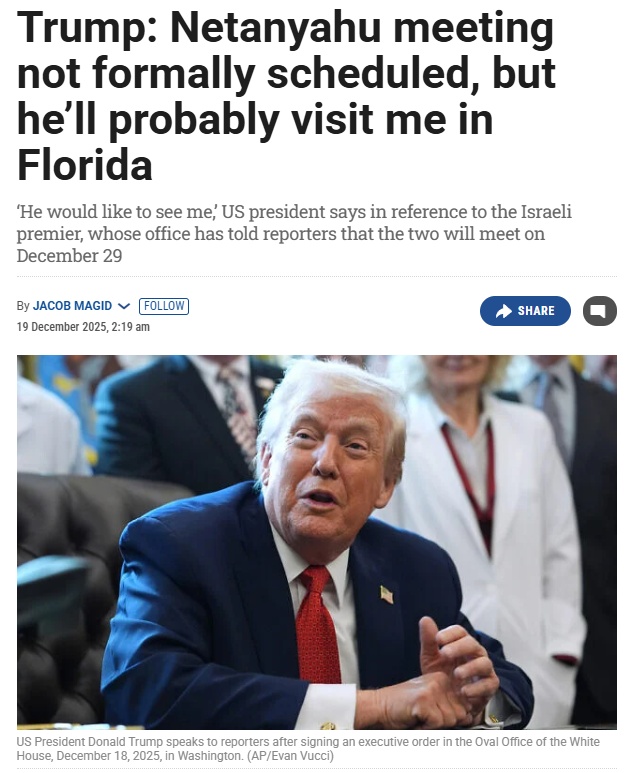 另据媒体报道,美国总统特朗普表示,白宫尚未“正式安排”他与以色列总理内塔尼亚胡的会面,但两人“有可能”于下周在佛罗里达州会面。而以方此前释放消息称:内塔尼亚胡将于12 月 29 日与特朗普会面,议题锁定加沙未来。