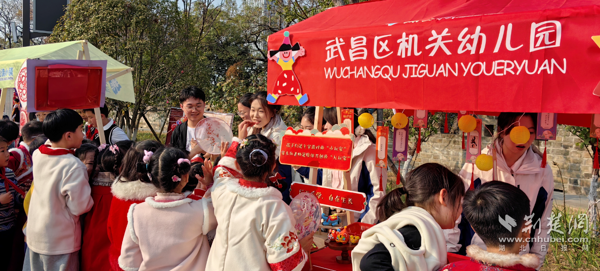武昌区机关幼儿园陈棋老师带着孩子们猜灯谜、赏泥塑,“我们把读书活动和孩子的年龄特点结合起来,猜灯谜、剪纸、泥塑、套圈……都是孩子喜欢的。他们通过熟悉的儿歌来猜动植物,连成语都可以玩起来。”
