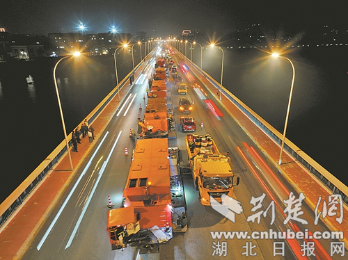 荆楚网(湖北日报网)讯(记者刘雪松 通讯员叶本林、虞菁瑶)12月18日22时,襄阳市长虹大桥启动桥面整体翻新作业,多台大型设备协同施工。该桥1992年通车,为连接襄城与樊城的关键通道,日均双向车流量约5万辆。因面层沥青老化、调平层混凝土强度下降及钢筋锈蚀,桥面出现坑槽、裂缝、车辙等病害,局部修补形成的补丁影响行车舒适性与桥容美观。