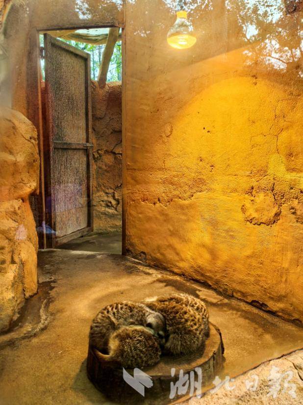 狐獴蜷缩在加热灯下“猫冬”。(湖北日报全媒记者 陈迹 摄)