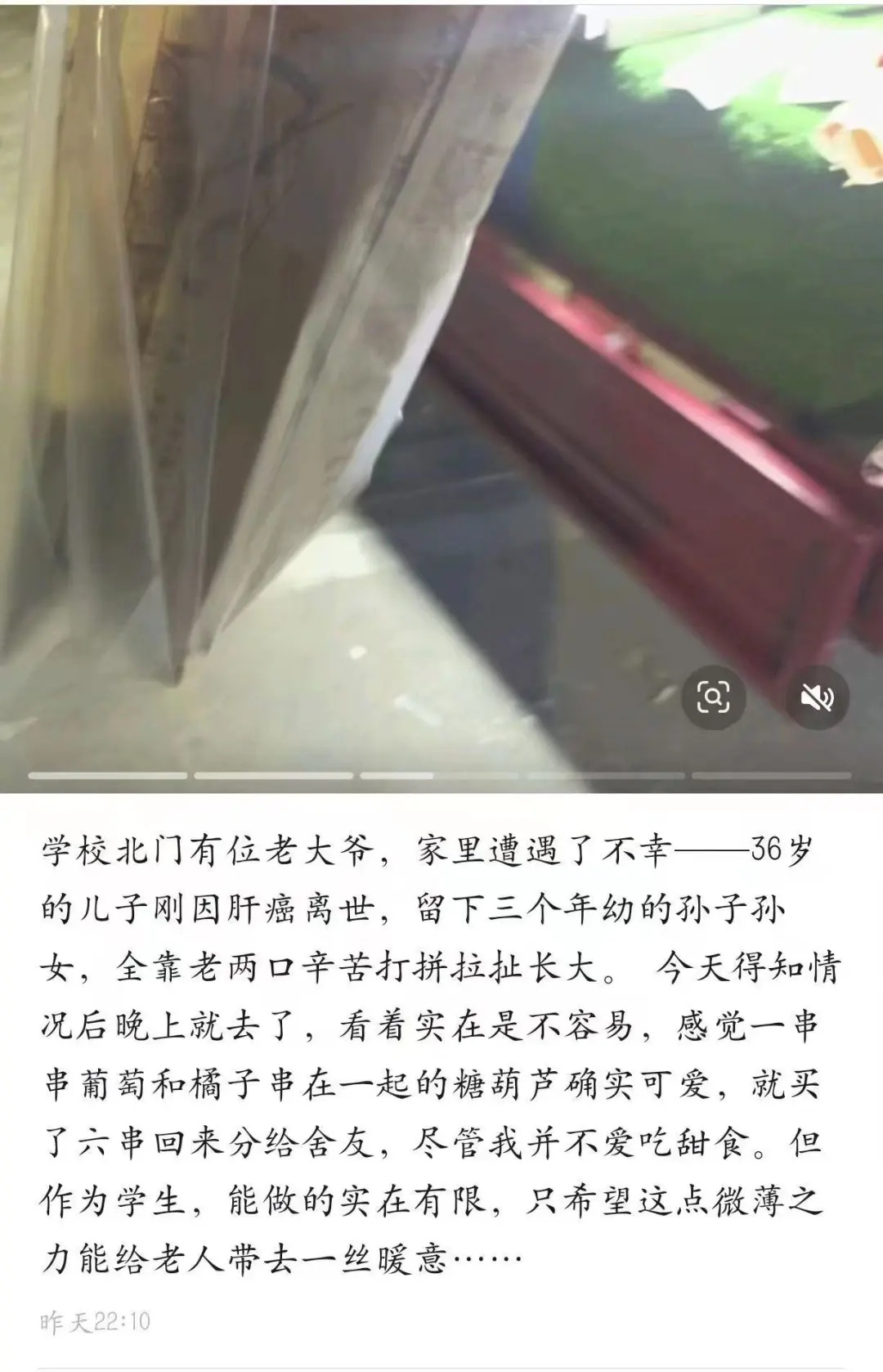 原来,田大爷的儿子在12月2日因病去世,留下了三个孙子,家里还有两位年迈的老人。还未走出丧子之痛的田大爷仍然出摊,维系一家人的生活。有相识的摊主将田大爷的遭遇发了出来,学生们和市民自发前往支持。