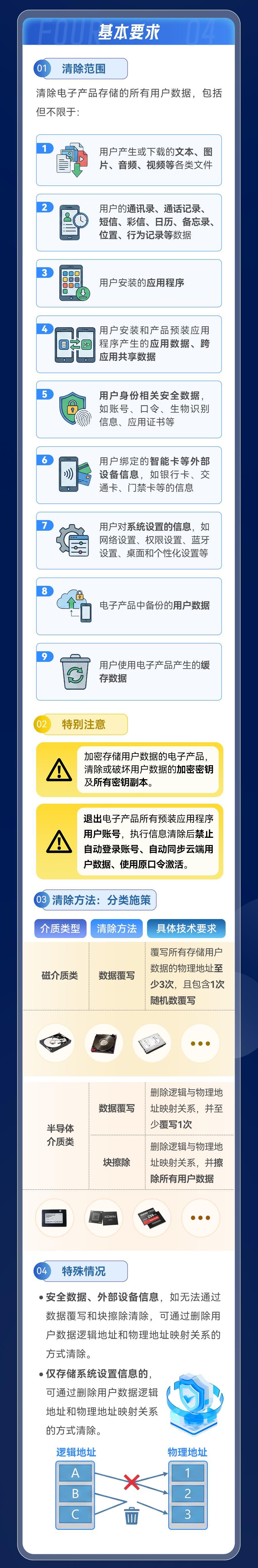 一是数据覆写。即向电子产品存储数据的每一个单元,反复写入无意义的随机数据,从而覆盖掉原有的用户信息。标准对不同介质提出了具体要求,例如对于传统的磁介质存储设备,要求至少覆写三次,其中一次必须是随机数覆写。 二是块擦除。主要针对半导体存储介质(如闪存),通过调用底层指令,对存储数据的物理块进行根本性的、不可逆的擦除操作。