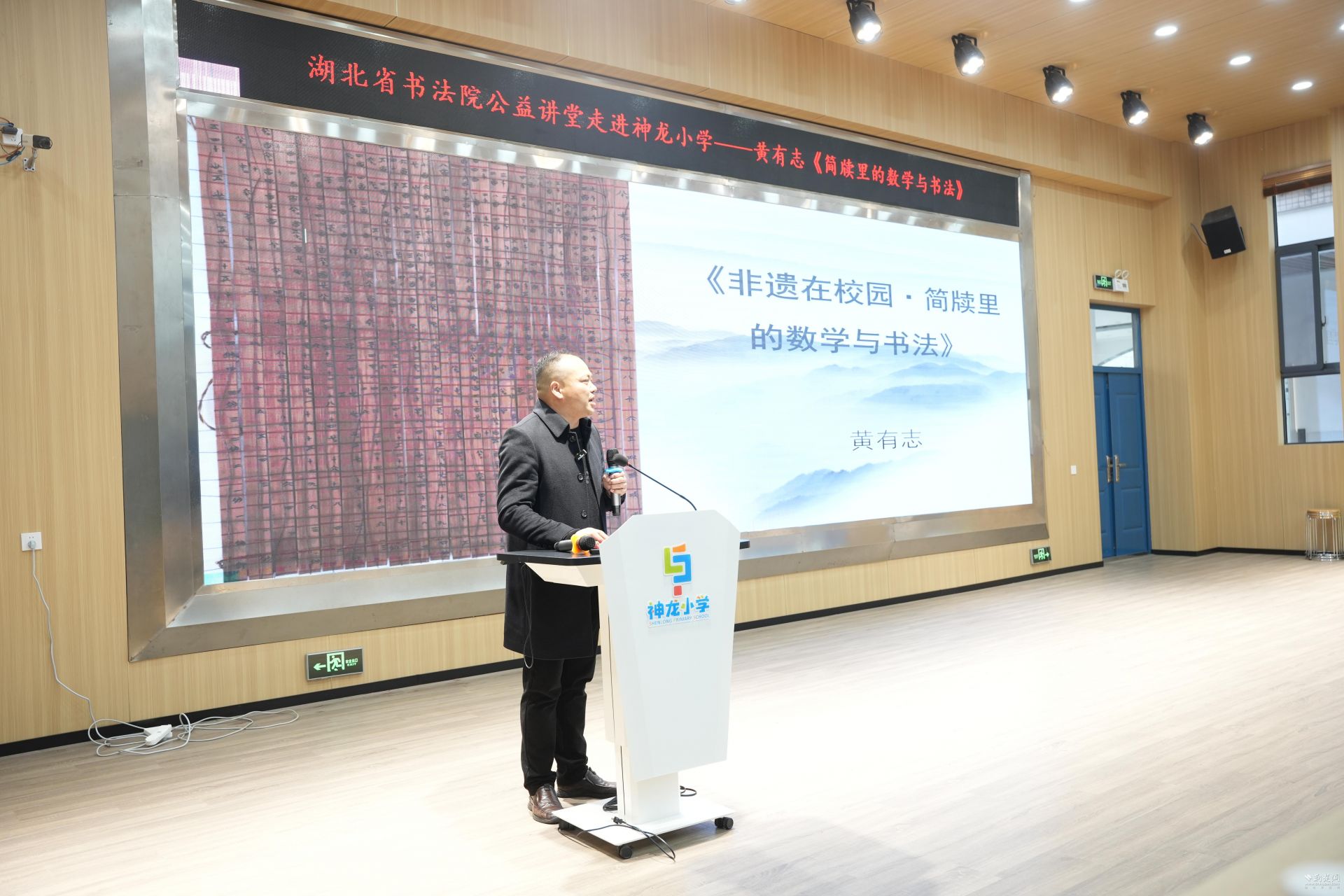 荆楚网(湖北日报网)讯(记者林杉 通讯员李欢)12月19日上午,湖北省书法院公益讲堂走进武汉经济技术开发区神龙小学。国家级非遗项目楚简制作技艺省级传承人、湖北省书法院楚简书法研究中心研究员黄有志,为师生带来了一场题为《非遗在校园·简牍里的数学与书法》的专题讲座。