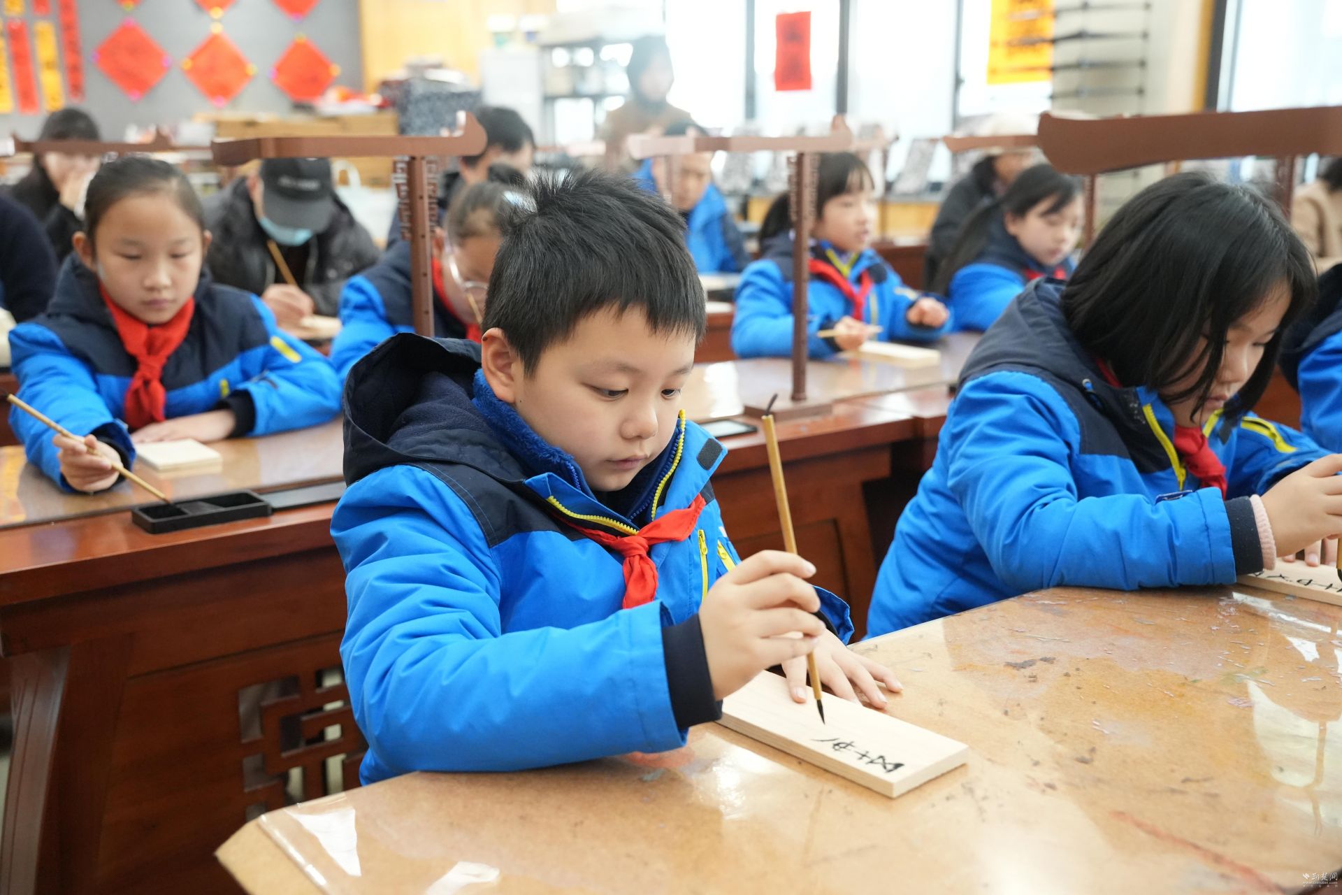 讲座结束后,活动转入实践环节。学生们移步书法体验课堂,在黄有志的现场演示与逐一指导下,亲手临写记载“九九术”的简牍作品。孩子们屏息凝神,专注运笔,在特制的木牍上留下了自己书写的第一行楚简数字。一方方小小的木牍,成为连接古今的独特媒介。