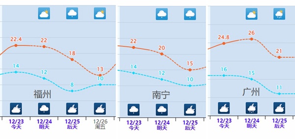 省会、首府中,福州、南宁25日最高气温将创今年下半年来新低,降至15℃或以下;广州25日最高气温也将降至20℃上下。