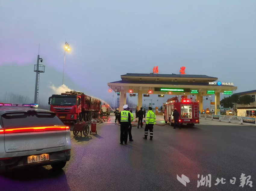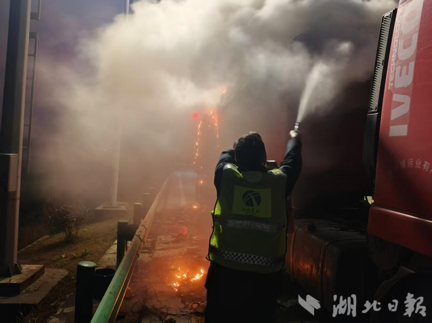 12月21日清晨6时17分,一辆六轴大货车驶入湖北交投福星收费站准备下站时,车厢后方突然冒烟起火。由于天气干燥,火势迅速蔓延,现场浓烟弥漫,情况紧急。初步判断,火情疑似由车辆机械故障引发。