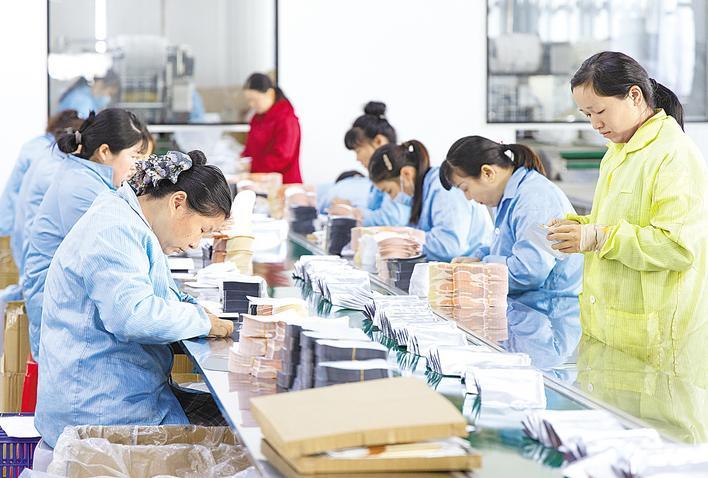 蕲春县漕河镇一家蕲艾企业生产车间里,女工们正在制作蕲艾护足暖贴。(湖北日报全媒记者 成熔兴 摄)