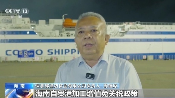 保亭椰泽坊食品有限公司负责人 周福琼:海南自贸港加工增值免关税政策,实实在在给我们减免12%的关税成本。低成本的椰子的确非常有竞争优势,确实给下游企业带来实惠。