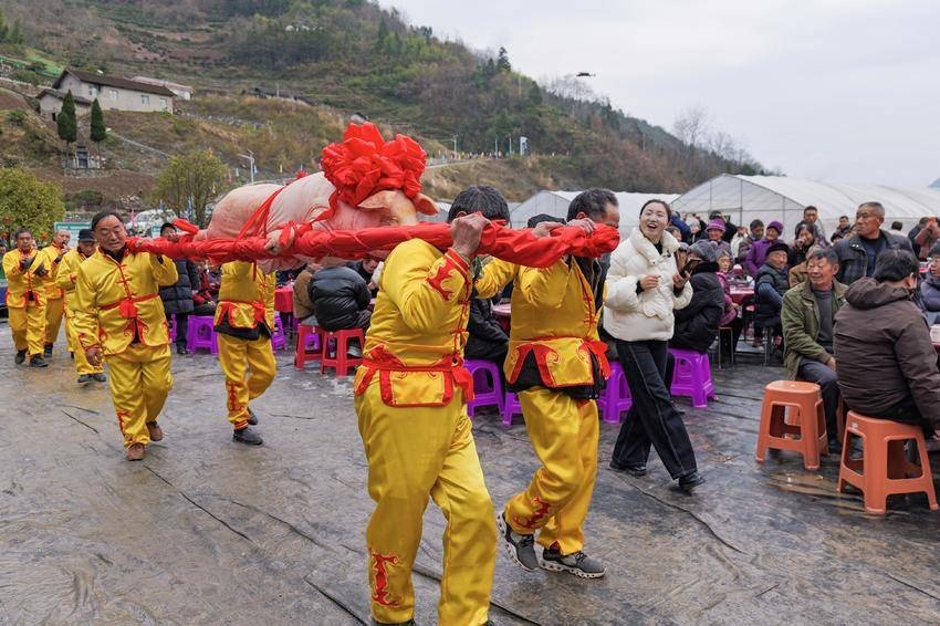 湖北日报客户端讯(通讯员赵媛媛)千余名村民乡贤共赴年猪盛宴,共叙乡情谋发展,12月24日,兴山县昭君镇滩坪村以“忆年味·享丰收·话发展·促振兴”为主题,创新举办首届年猪宴暨乡贤恳谈会,通过“民俗搭台、经济唱戏、乡情聚力”,激活乡村全面振兴内生动力,奏响和美乡村建设新乐章。