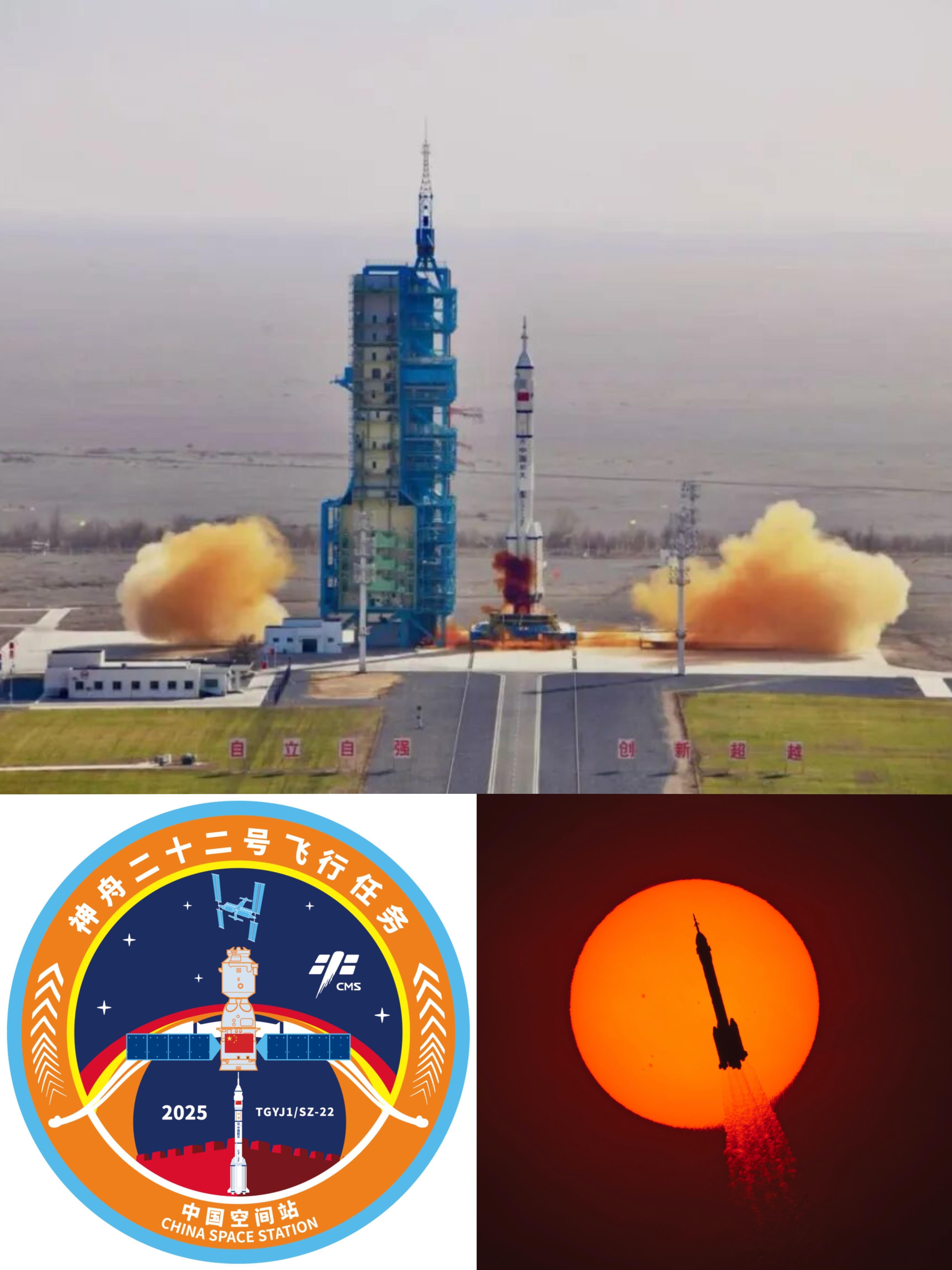 11月25日12时11分,神舟二十二号飞船在酒泉卫星发射中心发射成功,飞船为无人状态,装载了航天食品、航天药品、新鲜果蔬、针对神舟二十号飞船舷窗裂纹的处置装置,以及空间站所需的备品备件等,这是中国载人航天工程第1次应急发射任务。