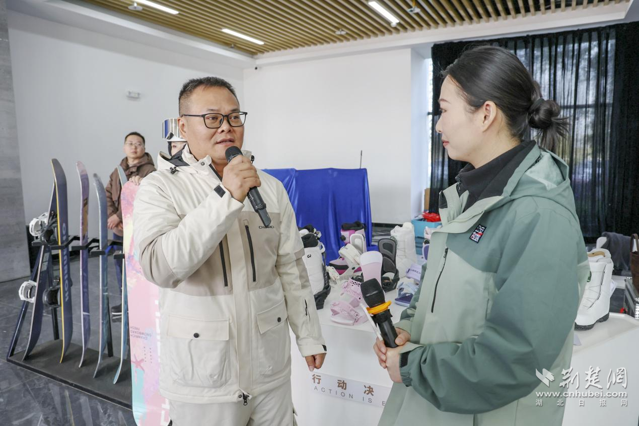 湖北翔驰运动用品股份有限公司副总经理熊伟在发布会企业访谈环节中,展示了其核心创新产品——可实现秒穿秒脱的“四点定位快穿固定器及雪靴”,并分享了企业从楚商回归到挂牌新三板、冲刺北交所的历程,以及助力中国选手在国际赛事夺牌的荣光。